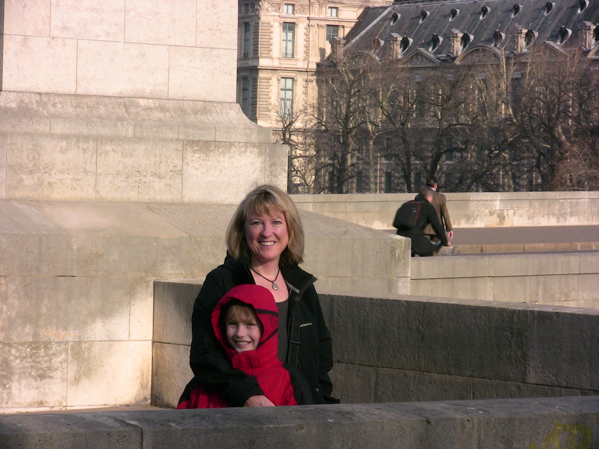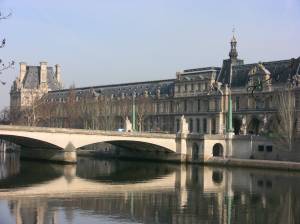 Paris, Lundi, le 22 mars — Today, we tackled the Louvre. Everyone slept well last night because all the rugby fans had gone home, and it was blissfully quiet outside the hotel. We had our usual croissant from Gerard Mulot around the corner and then headed off on foot for the Louvre, a short walk away across the Seine. It was an unexpectedly clear and fresh morning, no clouds in sight, as we walked along the Seine toward the enormous palace that now houses the Musee du Louvre. Will exclaimed that if stood on its end, it would be as tall as the Empire State Building.