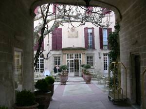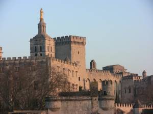 The train ride was otherwise uneventful. Just 2 1/2 hours all the way to the south of France, what would have been a 6 1/2 hour drive. And on the one leg of our journey I had not pre-planned to the nth degree — the ride from the train station to the hotel in Avignon — we of course were left standing at an empty taxi queue at the station with no taxis in sight — and some helpful person had scratched out part of the phone number to call a cab. The weather was beautiful, but we were all bundled up for cold, so we were HOT. A taxi swung around the corner in the glaring sun and Will leapt to his feet and shouted, “SOS!!” Well, needless to say we weren’t in danger of anything, and I managed to call a cab big enough to get us to our lovely old hotel just inside the medieval city walls of this city, home of the popes and the center of Christendom during the 14th century.