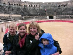 Next we drove to Nimes, home to the serge de Nimes, of Levi-Strauss fame (de-nimes, denim, get it, cool eh?), which caused Rick much stress trying to navigate the narrow roads, but was a great walkable city once we got parked. We had a nice lunch on top of the museum, then saw the “near-perfect-Roman-temple” Maison Carree (on which Thomas Jefferson based the Virginia statehouse) but it was wrapped in construction scaffolding, so a bit disappointing. We walked through the winding, pedestrian-only shopping streets of the central city to the Arena, a truly impressive stadium built at the same time as the Coliseum at Rome in about 100 A.D. It seated thousands of spectators to watch wild animals fight, prisoners put to death by animals and, most famously, gladiator fights. Will was transfixed by the stories of the gladiators. The arena is still used in the spring for bullfighting.
