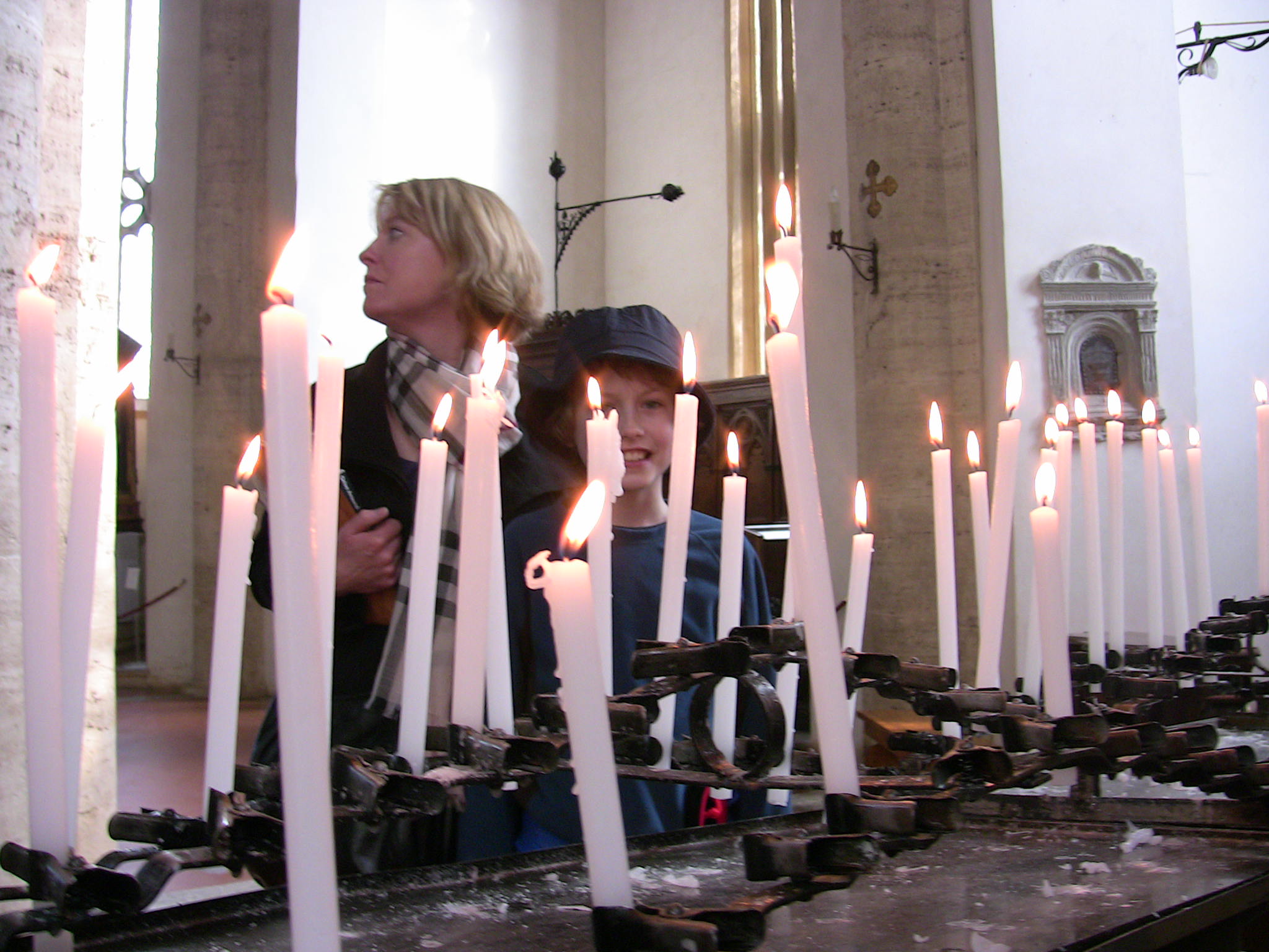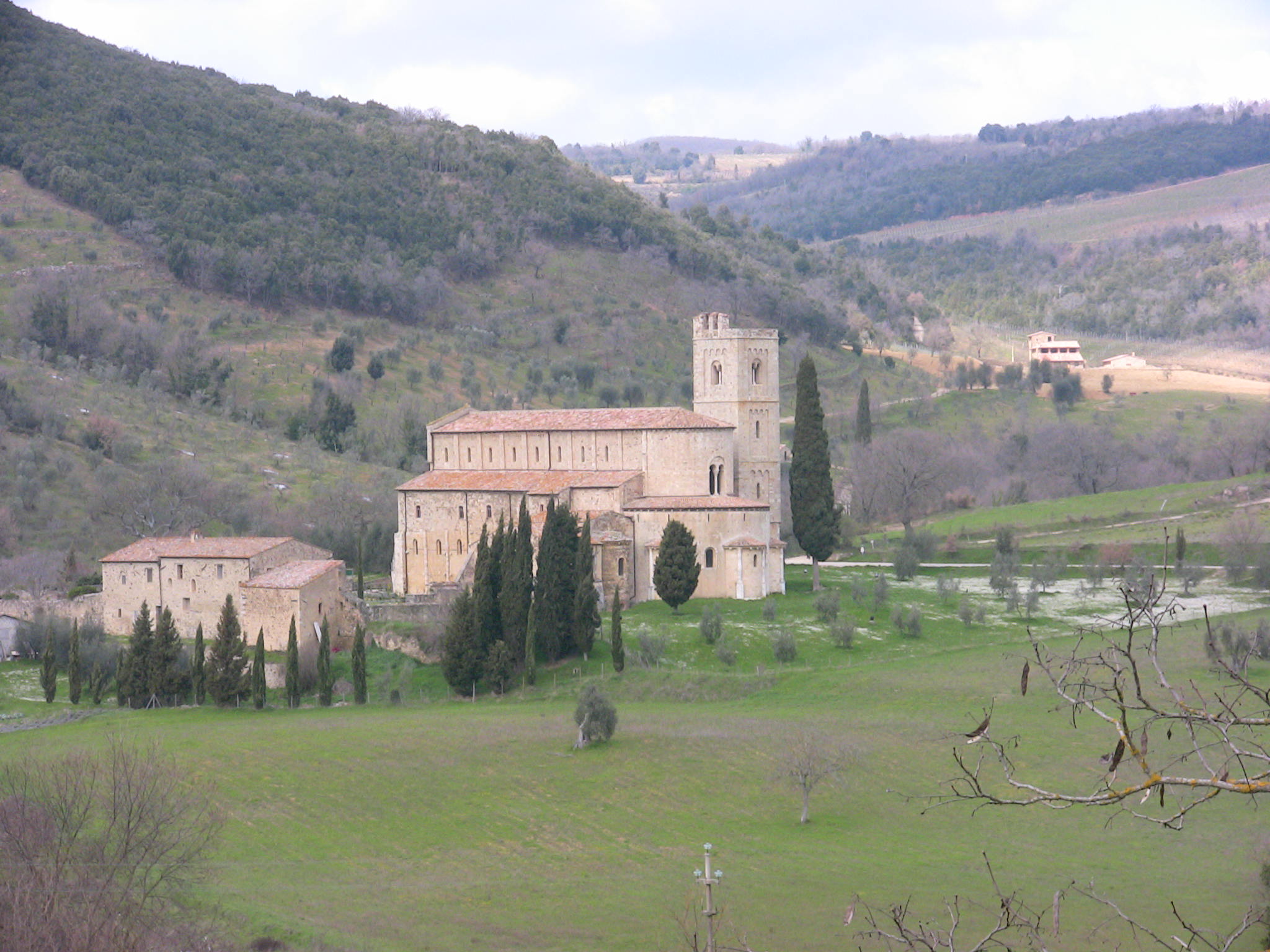 We got there just in time to catch the monks’ sixth prayer of the day — they chant in Latin at regular times during the day. We took a seat in a pew at the back and took in the scene: Rays of sunlight slanting in the high windows, the simple, unadorned surfaces of the high vaulted ceiling, the views of the Tuscan countryside through windows behind the altar and a lovely double-arched window at the back looking out on the sky. The monks’ voices were lovely, rising and falling and stretching out the single word Domine over about 20 syllables, so lyrical and evocative. It felt very holy. The nice man who tended the place — and shook his keys whenever some obnoxious visitor actually took a photograph during the chant — showed me a book that held all the prayers, in Latin and Italian, so we could follow along.