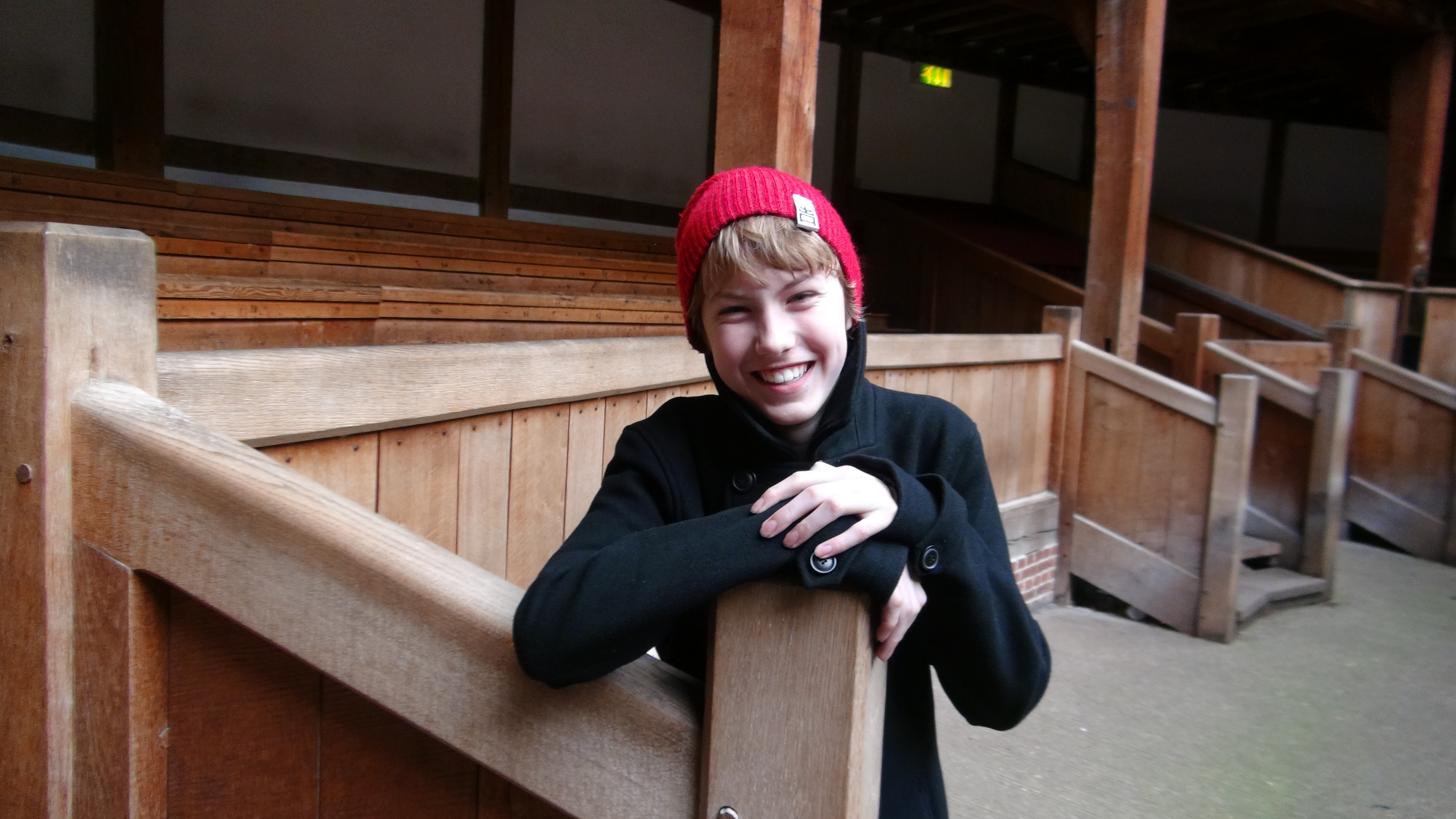 We then raced down the Thames to catch the last tour of the Globe, the vision of American director and actor Sam Wanamaker, built in the 1990s to recreate the theater that Shakespeare wrote for, down to the animal hair in the plaster walls. Rick was disappointed with the tour, since he wanted to hear how it was constructed, but it was interesting and wonderful to see. The guide talked more about the experience of the theater for a 16th century audience, who would pay one penny to stand in the pit at the base of the open air theater. More pennies got you a seat and better comforts, such as a pillow. The groundlings, or the 1,000 who crammed into the pit, apparently smelled quite atrocious, what with the lack of bathing and the penchant for eating raw garlic to ward off the plague. When they roared at the action on stage, apparently they let off a big stink, thus they were called the Pennystinkers. Rick thought the same name suited a certain boy we know and love, as well as a certain black Labrador. Our little Pennystinkers….