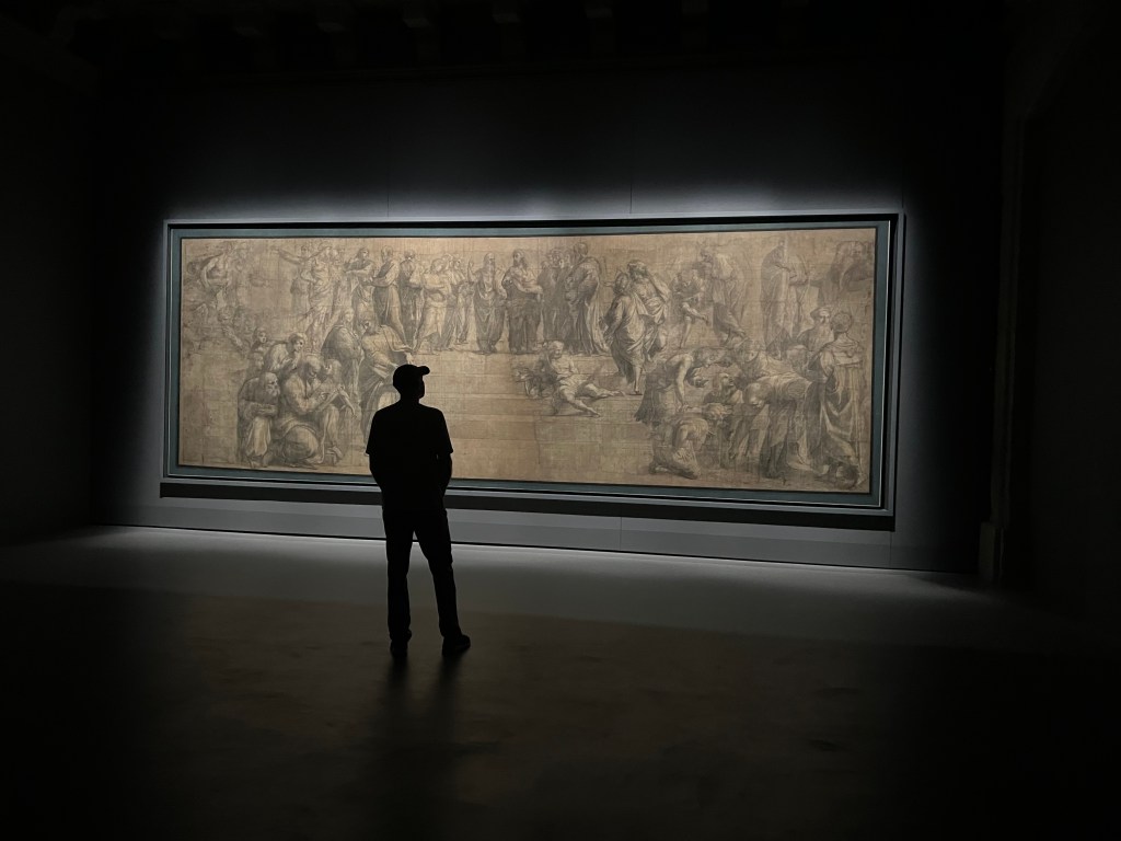 So far, however, this has been our only fail. Our last full day in Milan yesterday was a good, good day, which included all four of us visiting the Pinoteca di Brera art museum in the morning, where we saw many, many, many beautiful paintings of a half dozen or so Christian themes – or as Courtenay’s favorite virtual art professor Rocky Ruggiero lovingly puts it – “always the same damn thing.” Will and Amy escaped then for an afternoon of non-stop shopping across Milan’s famous fashion district, while Courtenay and I had lunch and went right back at it, venturing next to the Ambrosiana Art Museum. In fact, the Ambrosiana was wonderful. This compact museum is studded with great works, most notably a display of Raphael’s “cartoon,” his charcoal drawing, the actual blueprint, for my all-time favorite painting, “The School of Athens,” which we saw years ago in the Vatican Museums. Raphael’s huge drawing, well over twenty feet long, stands alone in an otherwise dark room, a powerful display and one of the coolest things I’ve ever seen. There were other great works in the Ambrosiana, including Caravaggio’s stunning Basket of Fruit and Titian’s painting of Mary Magdalene. After we left the Ambrosiana, we marched on to the historic San Lorenzo Maggiore and Sant Ambrogio churches, which are quite old, and just fine, but perhaps by then I was wearing down. While I hung in there with the art, more art, and the churches, Amy was guiding Will through Milan’s endless retail offerings, where he caught his breath on the strategically placed “boyfriend couches” outside dressing rooms. He seemed fine after his afternoon of shopping, cool even, in a new pair of sunglasses. The day, and our memorable stay in Milan, ended with a chef’s tasting dinner at Le Brisa, where we had a table on the edge of a lovely garden, and toasted our unforgettable time in a city that we enjoyed very much.