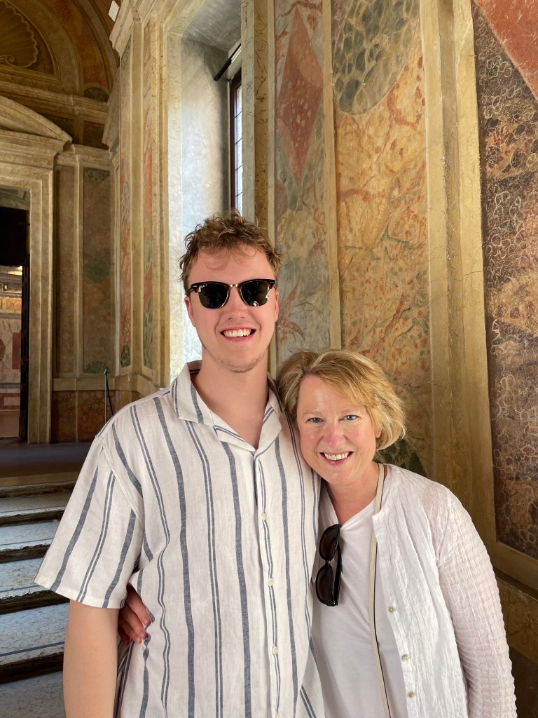 MANTUA, Italy — May 14, 2022 — We left Milan this morning, picked up a rental car, and made an uneventful two-hour-plus drive to Mantua, which welcomed us with this stunning view as we crossed the bridge over the lakes that ring the beautiful medieval city, the birthplace of the ancient Roman poet Virgil as well as a jewel box of Renaissance art and architecture. We were allowed to drive into and across the bumpy, busy main piazza to our hotel, the Palazzo Castiglioni, which hosts six large, incredible rooms in a renovated palace that sits right on the square. It was all so special, everything and everyone so nice, until we went to lunch, did a tour of the Palazzo Ducal, one of the highlights of Mantua, came back to our hotel hot, thirsty and in need of a break, only to learn that somewhere along the way I (Rick) had lost the key card that let us through the iron gates into the palazzo and on to our amazing rooms. During their fencing travels, Rick and (usually) Will have lost hotel room keys all over the United States and Europe, but this was a doozy, for it required Courtenay, who was already somewhat tired, frustrated by her husband’s inattention, and even less coherent in Italian than usual, to inquire about the lost key in several crowded locations, only to come up empty, while leaving behind a trail of confusion. We finally had to circle back and call the very nice hotel proprietor, who speaks little English, and seemed potentially short-tempered, to report that I’d managed to lose our key card after safely holding on to it all of an hour or so. Welcome to Mantua!
