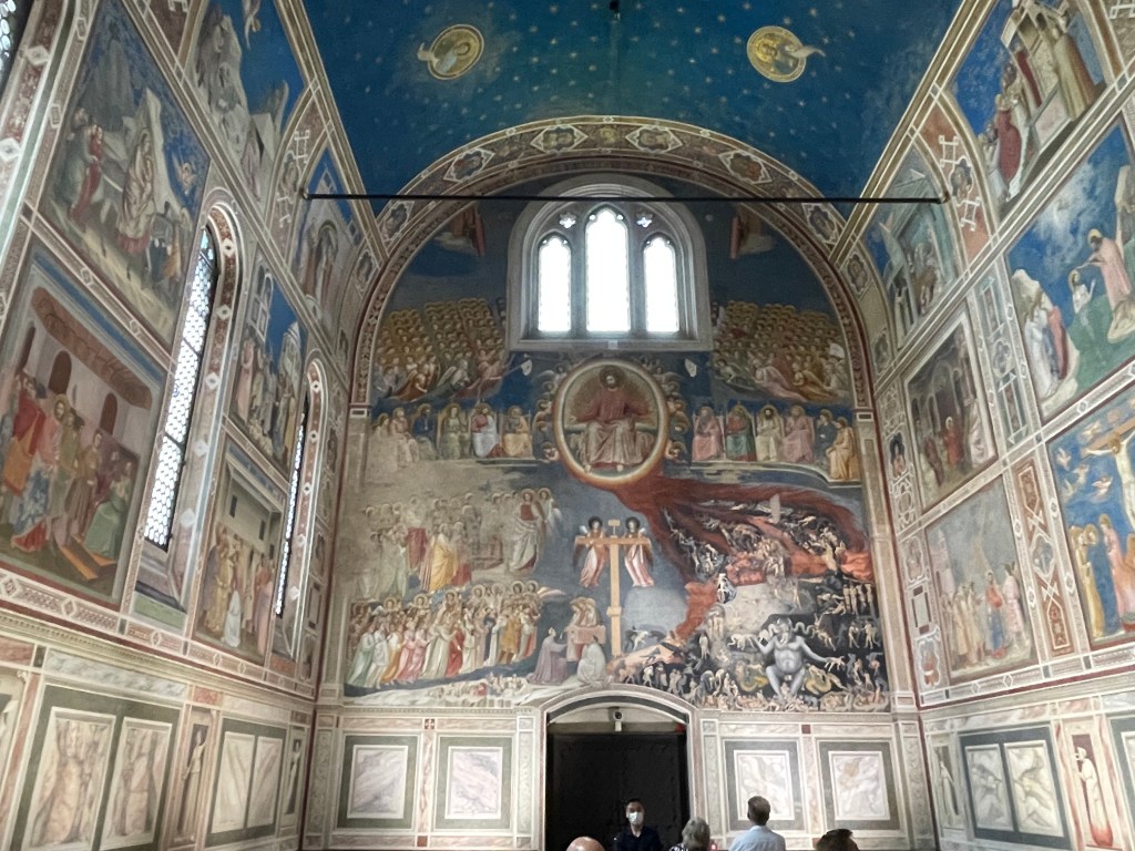 But all kidding aside, the Scrovegni chapel was breathtaking. I literally was moved to tears, not only by the beauty of the frescoes with their deep humanity – with pathos and humor instantly recognizable to a 21stcentury observer – but also that I was able to see them in my lifetime. With Covid and all, I wasn’t sure I would ever make it here. We only had 15 minutes in the small chapel – entry is restricted to limit the humidity, which can damage the frescoes, dating from 1303-05, but it was so moving to see them in person. Apparently, Dante (whose tomb we saw yesterday in Ravenna) was a friend of Giotto’s, and they are said to have hung out in the chapel while Giotto was painting it. You wonder if the depiction of hell in Giotto’s Last Judgement inspired Dante’s Inferno. The main walls are covered with deeply colored panels, telling the stories of the life of Mary, of Jesus and of his Passion and resurrection. It was hard to see the detail from the floor, but I had studied them in classes with Dr. Rocky (see previous posts) so I knew what to look for – the funny “side-eye” glance of a shepherd sizing up Joachim’s mental state, the bulbous, wine-sipping priest whose shape is reflected in the nearby wine jugs, the look of despair in the eyes of Mary lamenting her son, or the angels above who mourn with their whole bodies. And who can forget the two kisses – that of the parents of Mary – the “first kiss in Western art” according to Rocky – and the kiss of Judas, in which Jesus looks straight into Judas’s eyes at the moment of betrayal and basically melts him with his laser beam. These frescoes were part of the pre-Black Death zeitgeist in Europe, when Christianity, art and literature were being humanized, brought down to human scale. Dante was soon to write the Divine Comedy in the vernacular, in the Tuscan dialect, so that common people could understand it, if not read it themselves. At the time, everything written – and spoken by the priests in church – was in unintelligible Latin. Giotto was doing the same thing in paint, making the stories of the Bible human, making the people human, with real emotions, rather than the distant, otherworldly, highly stylized Byzantine figures of the Madonna and Jesus. This paved the way, after the Black Death, for the Florentine Renaisance of the 15th century. I tell you all this because it was incredibly exciting to see these frescoes, and think of all that came after, and before. They are just so beautiful, and even for a non-Christian, they are moving portraits of all the range of human emotion, and body language. People still make the same gestures, facial expressions, exclamations of full-body grief that people did 700 years ago.