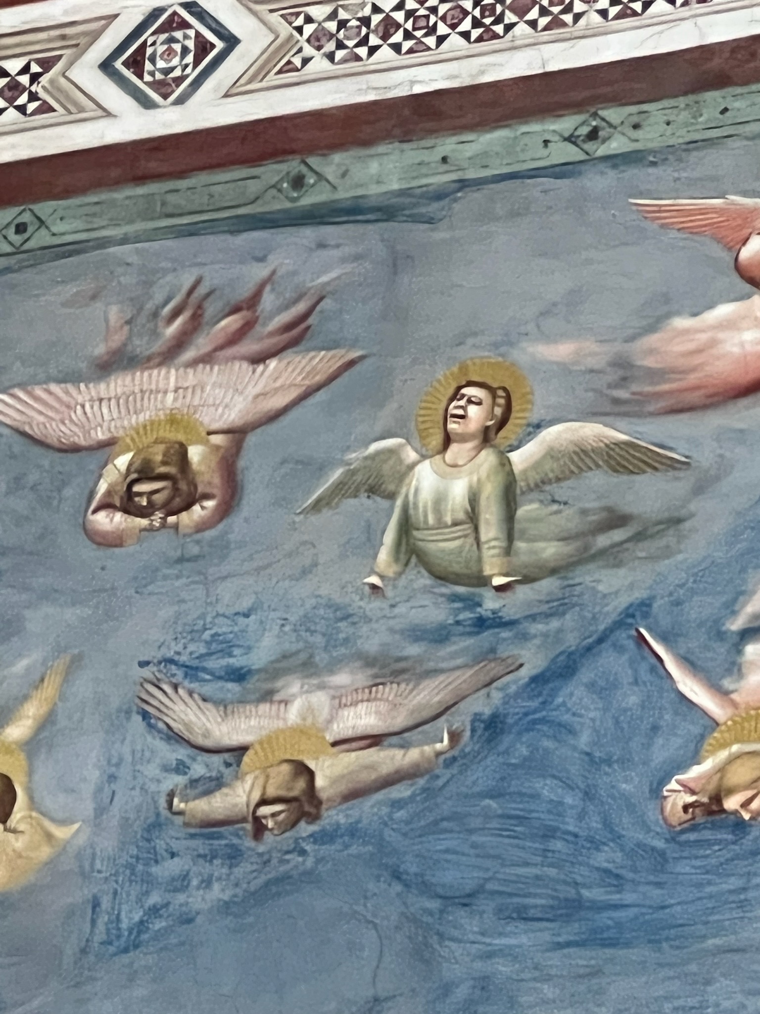 But all kidding aside, the Scrovegni chapel was breathtaking. I literally was moved to tears, not only by the beauty of the frescoes with their deep humanity – with pathos and humor instantly recognizable to a 21stcentury observer – but also that I was able to see them in my lifetime. With Covid and all, I wasn’t sure I would ever make it here. We only had 15 minutes in the small chapel – entry is restricted to limit the humidity, which can damage the frescoes, dating from 1303-05, but it was so moving to see them in person. Apparently, Dante (whose tomb we saw yesterday in Ravenna) was a friend of Giotto’s, and they are said to have hung out in the chapel while Giotto was painting it. You wonder if the depiction of hell in Giotto’s Last Judgement inspired Dante’s Inferno. The main walls are covered with deeply colored panels, telling the stories of the life of Mary, of Jesus and of his Passion and resurrection. It was hard to see the detail from the floor, but I had studied them in classes with Dr. Rocky (see previous posts) so I knew what to look for – the funny “side-eye” glance of a shepherd sizing up Joachim’s mental state, the bulbous, wine-sipping priest whose shape is reflected in the nearby wine jugs, the look of despair in the eyes of Mary lamenting her son, or the angels above who mourn with their whole bodies. And who can forget the two kisses – that of the parents of Mary – the “first kiss in Western art” according to Rocky – and the kiss of Judas, in which Jesus looks straight into Judas’s eyes at the moment of betrayal and basically melts him with his laser beam. These frescoes were part of the pre-Black Death zeitgeist in Europe, when Christianity, art and literature were being humanized, brought down to human scale. Dante was soon to write the Divine Comedy in the vernacular, in the Tuscan dialect, so that common people could understand it, if not read it themselves. At the time, everything written – and spoken by the priests in church – was in unintelligible Latin. Giotto was doing the same thing in paint, making the stories of the Bible human, making the people human, with real emotions, rather than the distant, otherworldly, highly stylized Byzantine figures of the Madonna and Jesus. This paved the way, after the Black Death, for the Florentine Renaisance of the 15th century. I tell you all this because it was incredibly exciting to see these frescoes, and think of all that came after, and before. They are just so beautiful, and even for a non-Christian, they are moving portraits of all the range of human emotion, and body language. People still make the same gestures, facial expressions, exclamations of full-body grief that people did 700 years ago.