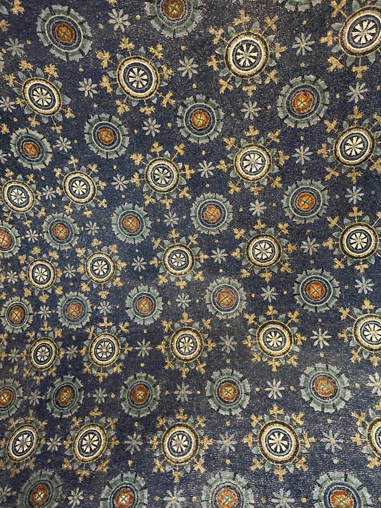 Fast-forward to yesterday – when we went to another important city and art pilgrimage site – Ravenna, a long two-hour drive south of Venice. A professor at Stanford, Martin Evans, who has since passed away, said once in a class I was in that everyone should try to go to Ravenna once in their lifetime to see the incredible mosaics from late antiquity. So I did. Finally. This ancient capital of the Roman Empire as it was collapsing in the 5th century has some of the world’s best preserved and most beautiful ancient mosaics  – probably because it is so far out of the way no one bothered to plunder them. Our favorite was the Mausoleum of Galla Placidia – the 5th century AD daughter of an emperor who once wrote love letters to Attila the Hun – she was a scream. It isn’t believed she is buried here, but it is an absolute jewel box worthy of an imperial personage or a girlfriend of Attila. The deep blue sky of the small dome sparkled with gold stars looked like an ancient Persian rug, the beautiful plants, animals and Apollo-esque Jesus-as-Shepherd, all felt deeply tied to pagan antiquity. While the other monuments felt more political – the Emperor Justinian declaring his sovereignty (he had retaken Italy from the barbarians in the 6th century) in his portrait in San Vitale, or the wholesale re-writing of the mosaics at Sant’ Apollinare in Nuovo, where the barbarian-yet-Christian Theodoric had his courtiers repurposed as Christian martyrs by later Catholic re-conquerers. If all that sounds confusing, don’t worry, it is. But it was amusing – or canny – that the mosaicists failed to airbrush out the hands of his courtiers, still stubbornly holding onto the columns of the palace. Their bodies had been “mosaicked” over with curtains. But everywhere, the colors of the tiny tiles and the skill of the unnamed mosaicists were stunning. We had let Will and Amy go their own way, dropping them at the beach, while Rick and I sped through the beautiful old town, hopping from mausoleum to basilica. We had intended to take Will and Amy to one last mosaic-filled church on the way out of town, but it got so late we had to skip that last church. So they will have to come back on their own, one day, and see these mosaics themselves.