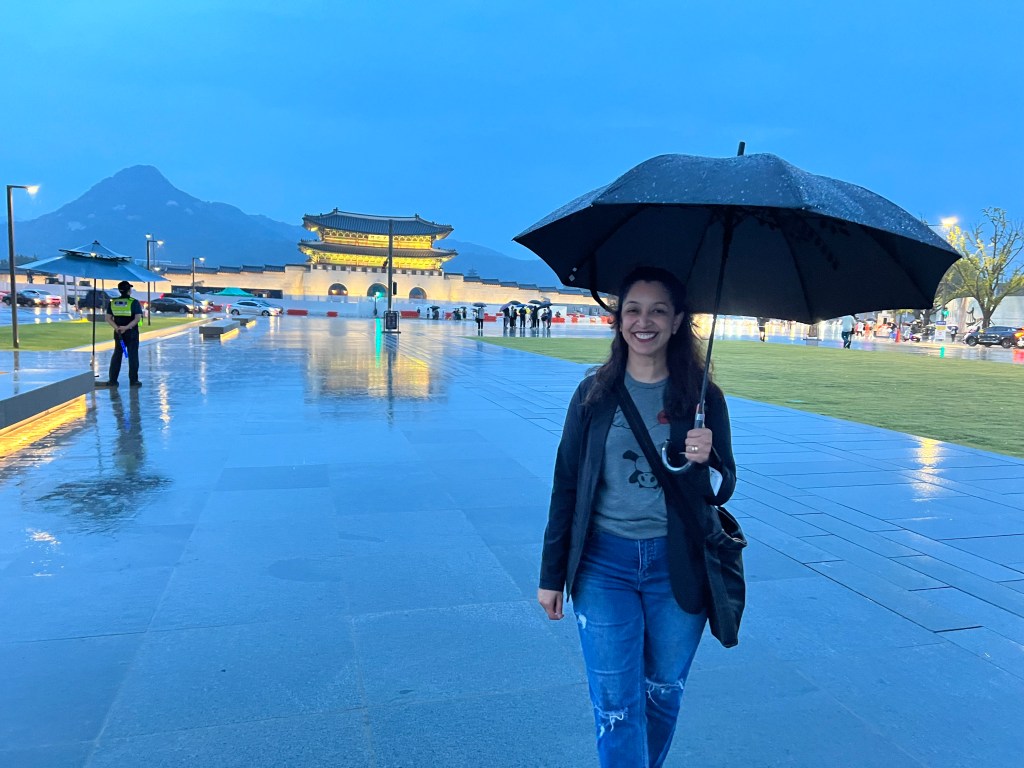 Asma arrived in the late afternoon, just as it began to pour. But she, too, was a gamer and declared that after her exhausting plane ride (coming shortly after a long shift being a doctor), she was up for a walk in the downpour. So off we went down to City Hall, and up to the Gyeongbokgung Palace, past sad clusters of people with rain gear and umbrellas, braving the rain to watch events of the various festivals celebrating modern Korean culture. If the weather had been nice, I think the square would have been crowded with people. I had thought it would be surreal to see Asma here, but strangely, it seemed completely natural to me.