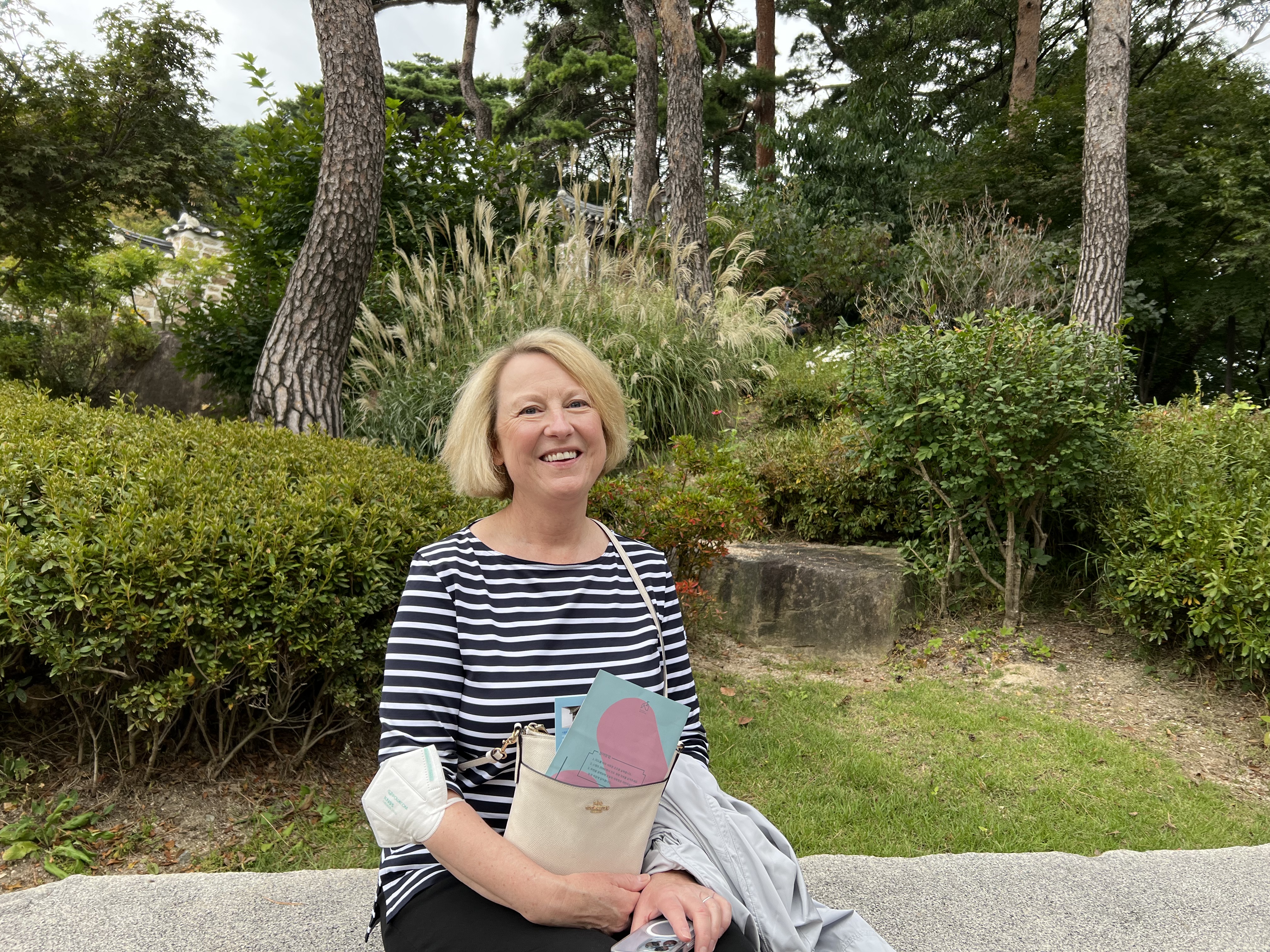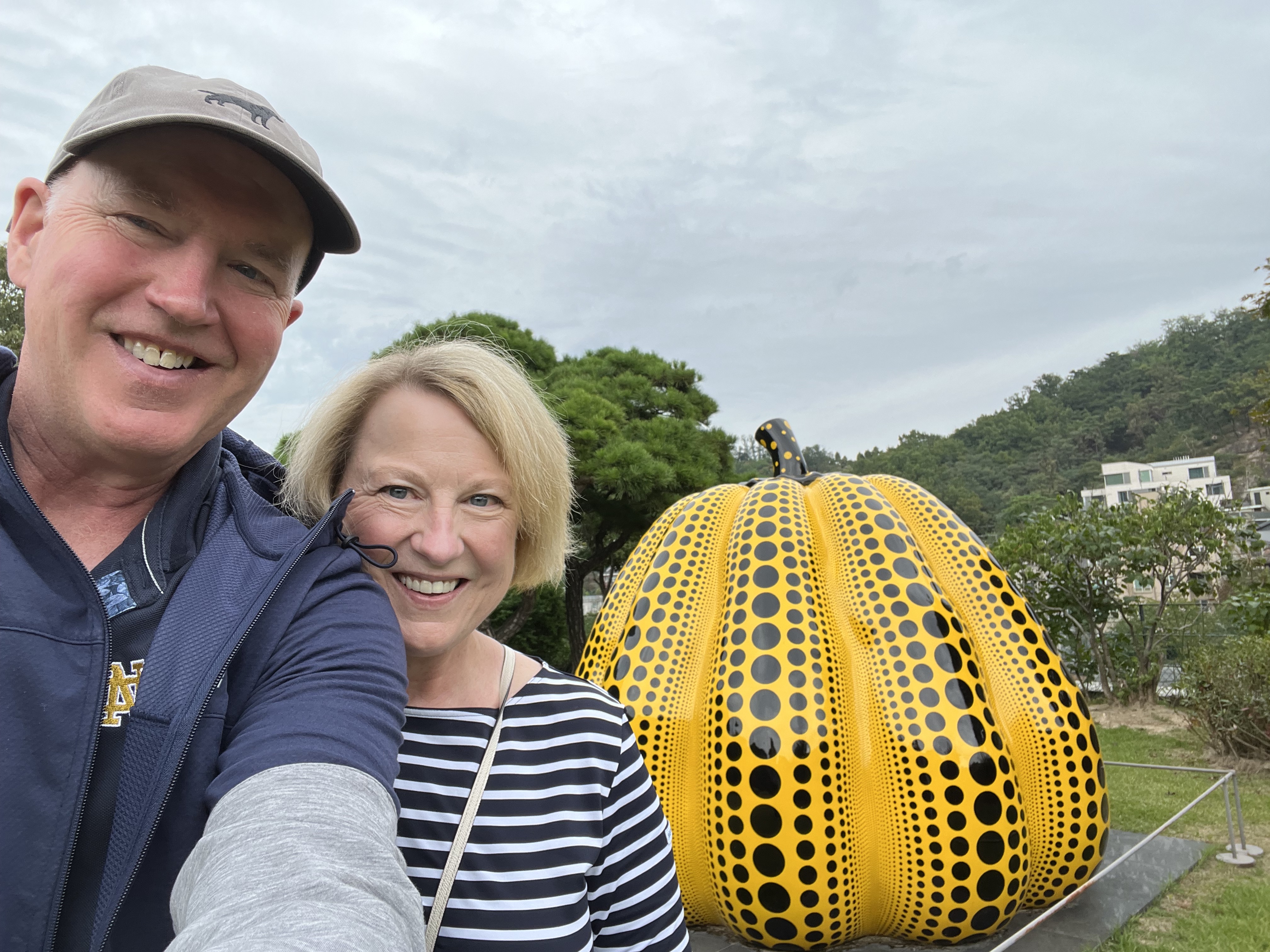Sunday, Oct. 3, 2022 – It was another perfect day in Seoul, starting with a visit to a hillside museum and traditional garden overlooking the skyscrapers of downtown and ending with the arrival of Asma and a stroll through a downpour to see the lights and flashing video screens of a festival celebrating Korean pop culture. Modern Seoul is bright and shiny and constantly moving, like the hypnotic, dreamlike video art that is everywhere – on the sides of buildings, at subway entrances, inside museums. But today we were reminded of how that modern culture taps into centuries of history, how the modern high rises are backed by mountains where hikers still walk on the ancient walls, and modern painters look to ancient ceramics for inspiration.