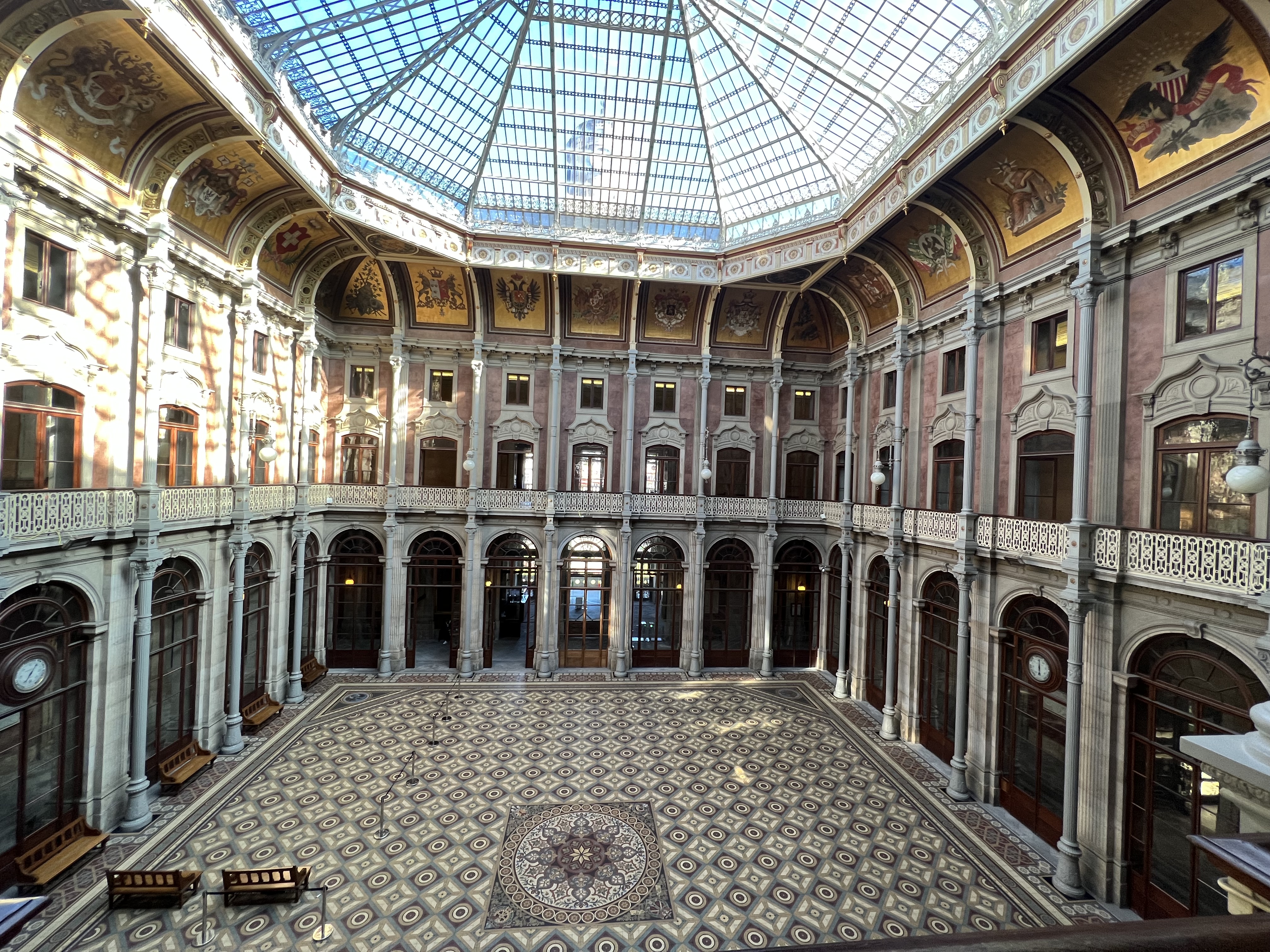 Finally Porto. It is a charming city, set on a hill overlooking the Douro River. On the south ban of the river is Gaia, where all the port wine cellars are located. We had a nice day Friday, when we toured the Palacio da Bolsa, which is not really a noble palace but a shrine built to commerce. The city’s merchants built the palace in the 19th century to house their various trade organizations – it is opulent, which inlaid floors, 1.5-ton chandeliers, and the best faux wood walls I have ever seen. The visit requires a guide, since the building is still the working office of the trade organization, though you can rent out any of the rooms for private events. The most-rented room – which goes for between $4,000 and $15,000 – is the last room we visited – with a Turkish theme, a gift from Queen Mary II. The guide seemed to take particular delight that the room had been rented for the first time last year to celebrate a divorce.
