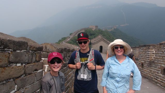 It was a great start to our vacation, after a rough landing yesterday. The plane ride was a bit bumpy the last three of nearly 12 hours, and Rick and Will were green by the time we landed. Like both were clutching barf bags. We made it past customs and were greeted in a very crowded airline terminal by a big red Stanford “S” held by Catherine Zhong, a native Beijinger who will be one of the guides on our Stanford Alumni tour. We were a bit delirious with jetlag, and she cheerfully guided us to a car for our ride to our hotel. She shared great stories about the history of Beijing and her own family – both a father and an uncle who had attended Stanford in the 1930s, only to return to join the war effort against the Japanese. Her dad was an interpretor for the Americans helping in the air strike effort. Her uncle was an engineer who helped raise herself and nearly 30 siblings and cousins in Beijing during the Cultural Revolution, when her parents (her dad an intellectual, a chemistry professor) were sent to the countryside as part of Mao’s craziness. People have been through so much here. Catherine been a tour guide in Beijing for the last 30 years, and was just such a warm welcome to this city of 22 million people. Let’s see, that’s 7 times more people than the whole state of Oregon, right?