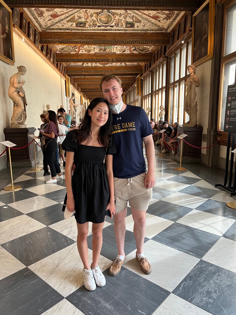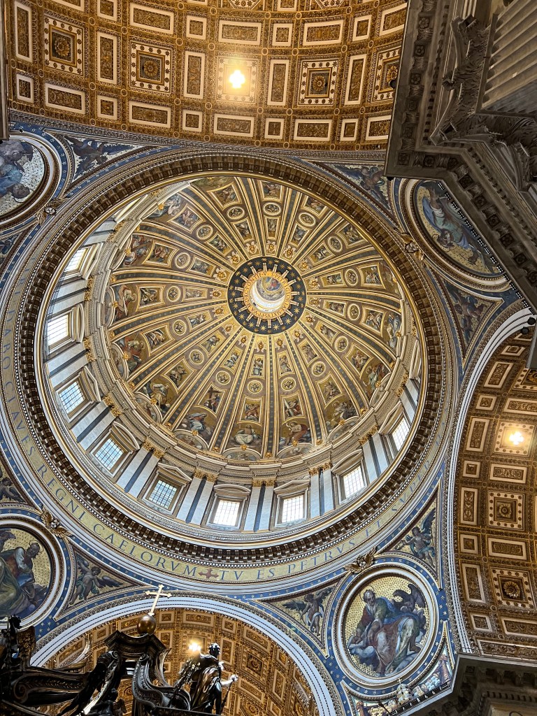 ROME – Tuesday, May 24, 2022 – I was dreading this day – in the best possible way – because I had bought a private tour for the Vatican that started at 7:15 a.m. and I had no idea what to expect, except that Will and Amy would likely be fairly grumpy to get up at 6 a.m. to see yet ANOTHER museum and church. It turned out to be absolutely wonderful – we had a guide for just the four of us, and she took us through parts of the vast collections of the Popes, seeing treasures from the ancient world – statues that changed the way we see – to the Renaissance and beyond. The ornate palaces of the popes, their self-aggrandizing art, their pillaging of ancient monuments, the famous Papal apartments of Pope Julius II with the amazing Raphael paintings, the Sistine Chapel! Rick was able to see his beloved School of Athens, which Will apparently was drawn to as well, with Aristotle holding his book the “Ethics,” a work Will has been wrestling with for the past year at Notre Dame. We also waited a half hour in the hot morning sun to see St. Peter’s Basilica, an awe-inspiring space the length of one and a half football fields and whose side arms are bigger than most churches. Rick commented that most of the churches we have seen on the trip would fit inside this one glorious space. Will perhaps gave it his highest compliment ever, saying it was like a movie.