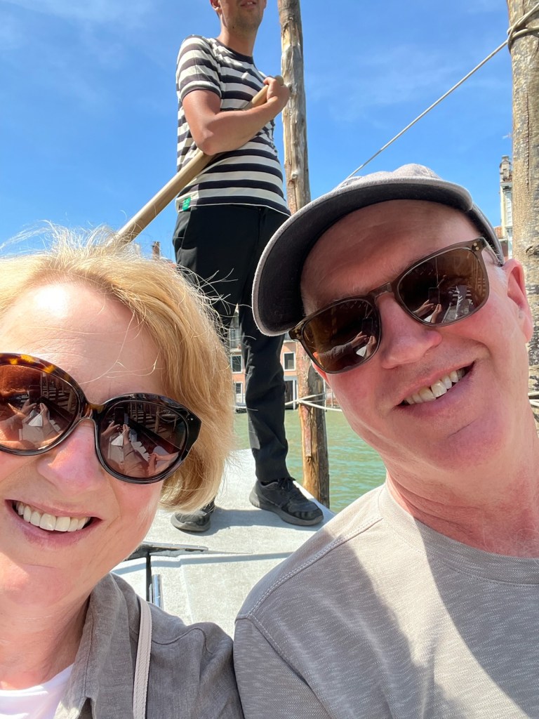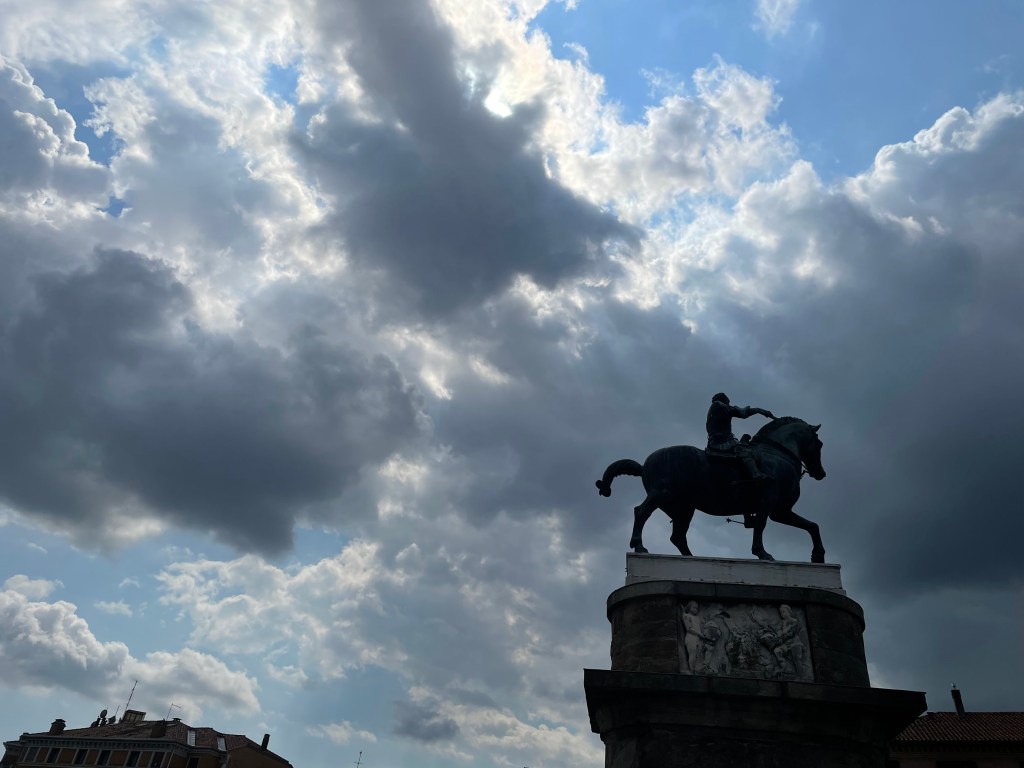 VENICE, Italy — May 17, 2022 — We arrived in Venice as dark clouds gathered at the end of an unseasonably hot May day, winding our way up a twisting ramp to the sixth floor of a parking garage on the city’s edge and then dragging our bags up and over a half dozen pedestrian bridges on a twenty-minute trek to reach our AirBnB. We tried to eat at a pizza place that sits just below our rooms on the edge of Campo San Polo, Venice’s largest and prettiest piazza, but were refused an outside table because of the possibility of rain. Grumpy and frustrated, we took our pizza up to the rooms, but quickly cooled off when the clouds opened up, and we sat watching the heavy rain pound down on the beautiful piazza, and sheet lightning flared over Venice late into the night.
