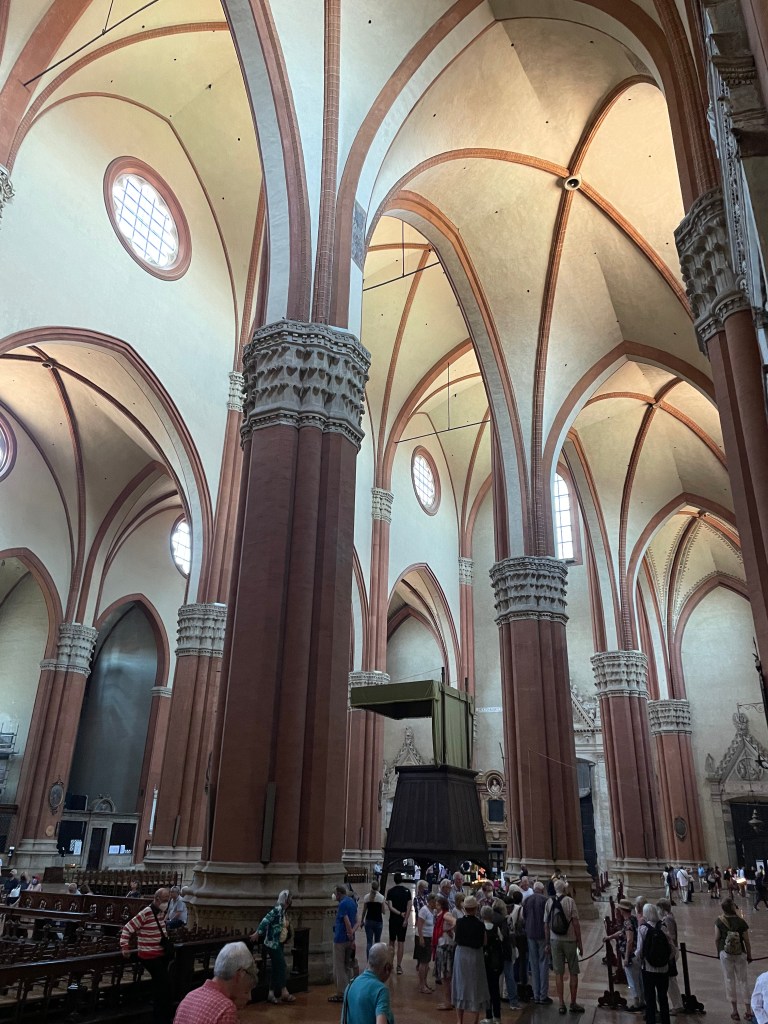 After loooooong hours of driving and perhaps 500 traffic circles, we arrived at Bologna last night, after driving from Venice to Ravenna, to the beach, to Ravenna again, to the beach, and then finally to Bologna. Bologna is a great city, with an estimated 40 km of covered porticoes – we had breakfast under a wooden one dating back to the 13th century – and swarms of young people. It is crowded but not with tourists – yes, there are tourists too, but mostly it seems to be university students, and people rushing to work – many on the not-quite-sea-worthy bikes that are ubiquitous. It has a nice vibe, and tons of great food, and shopping, and energy. We are glad we had a quiet day here and are gathering our energy for our trip to Florence tomorrow, where we will meet up with Grazia again.