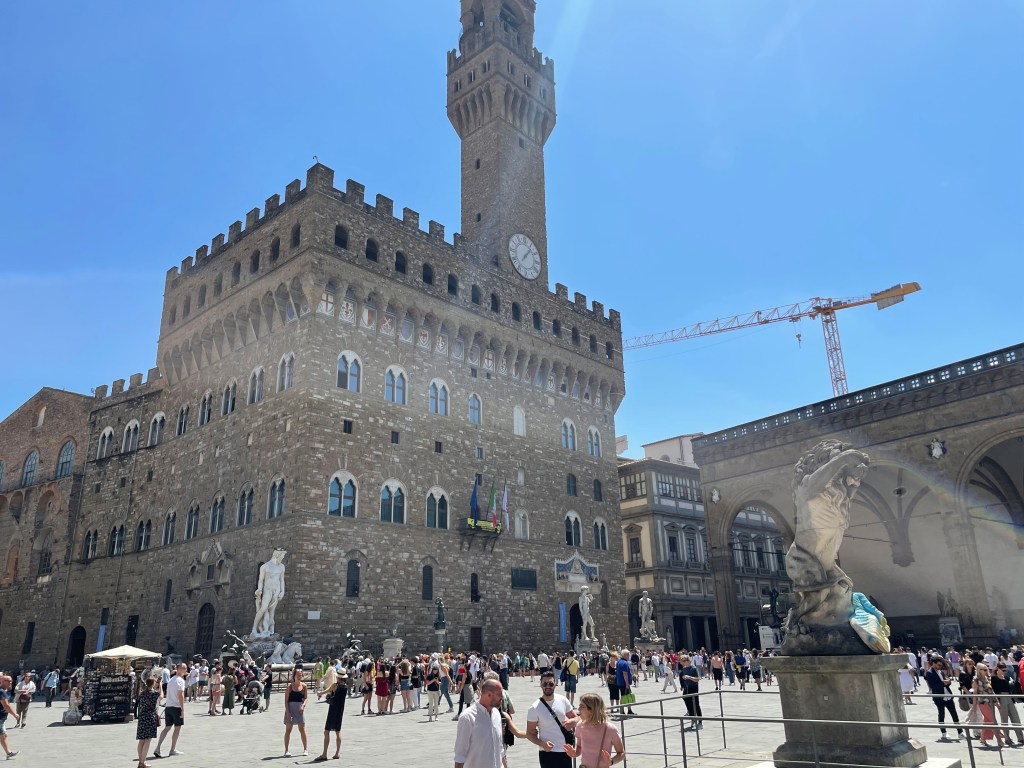 We had a wonderful, if very brief, stay in Florence, where we met up again with Grazia, who drove the 1 ½-hour drive to brave the heat and the crowds of a Florentine weekend with us. Florence is a small medieval city, with narrow, winding streets despite the best attempts of the ancient Romans to set it up as a traditional grid-patterned Roman military camp – the traces of which still remain in the main (wider) streets and the piazzas, one of which was the old Roman Forum. But I digress. The fact is that Florence is small, so when it is filled with masses of tourists – as it was this weekend – it feels extremely crowded. Regardless of what you may read in the news, European travel is full-on this summer. There were many Americans among the throngs, many of them young, but we also heard UK English, German, Russian, Chinese and Italian spoken among the tourists.