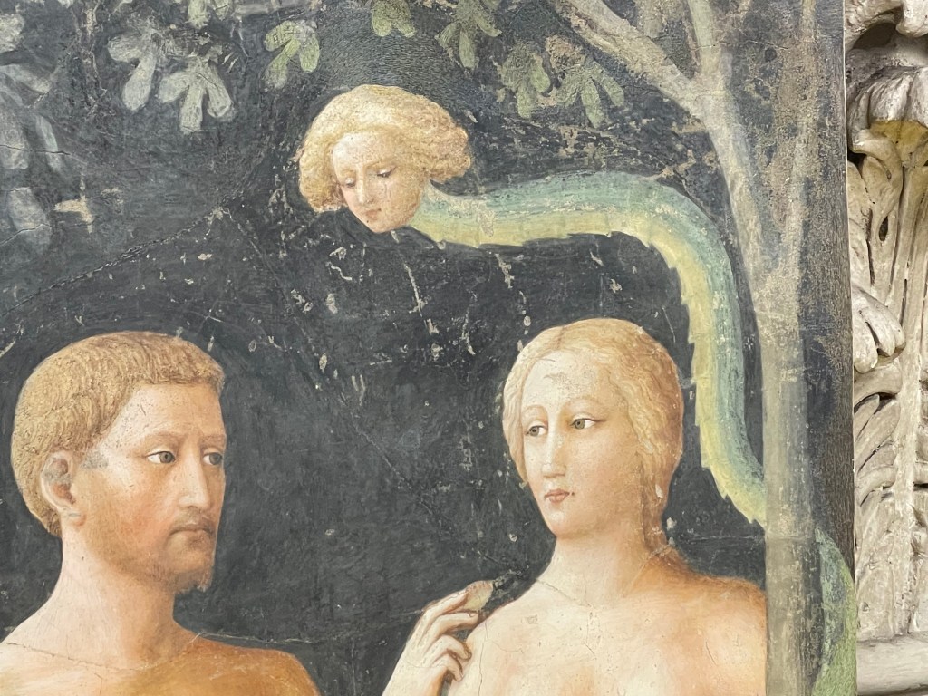 But all kidding aside, the Scrovegni chapel was breathtaking. I literally was moved to tears, not only by the beauty of the frescoes with their deep humanity – with pathos and humor instantly recognizable to a 21stcentury observer – but also that I was able to see them in my lifetime. With Covid and all, I wasn’t sure I would ever make it here. We only had 15 minutes in the small chapel – entry is restricted to limit the humidity, which can damage the frescoes, dating from 1303-05, but it was so moving to see them in person. Apparently, Dante (whose tomb we saw yesterday in Ravenna) was a friend of Giotto’s, and they are said to have hung out in the chapel while Giotto was painting it. You wonder if the depiction of hell in Giotto’s Last Judgement inspired Dante’s Inferno. The main walls are covered with deeply colored panels, telling the stories of the life of Mary, of Jesus and of his Passion and resurrection. It was hard to see the detail from the floor, but I had studied them in classes with Dr. Rocky (see previous posts) so I knew what to look for – the funny “side-eye” glance of a shepherd sizing up Joachim’s mental state, the bulbous, wine-sipping priest whose shape is reflected in the nearby wine jugs, the look of despair in the eyes of Mary lamenting her son, or the angels above who mourn with their whole bodies. And who can forget the two kisses – that of the parents of Mary – the “first kiss in Western art” according to Rocky – and the kiss of Judas, in which Jesus looks straight into Judas’s eyes at the moment of betrayal and basically melts him with his laser beam. These frescoes were part of the pre-Black Death zeitgeist in Europe, when Christianity, art and literature were being humanized, brought down to human scale. Dante was soon to write the Divine Comedy in the vernacular, in the Tuscan dialect, so that common people could understand it, if not read it themselves. At the time, everything written – and spoken by the priests in church – was in unintelligible Latin. Giotto was doing the same thing in paint, making the stories of the Bible human, making the people human, with real emotions, rather than the distant, otherworldly, highly stylized Byzantine figures of the Madonna and Jesus. This paved the way, after the Black Death, for the Florentine Renaisance of the 15th century. I tell you all this because it was incredibly exciting to see these frescoes, and think of all that came after, and before. They are just so beautiful, and even for a non-Christian, they are moving portraits of all the range of human emotion, and body language. People still make the same gestures, facial expressions, exclamations of full-body grief that people did 700 years ago.
