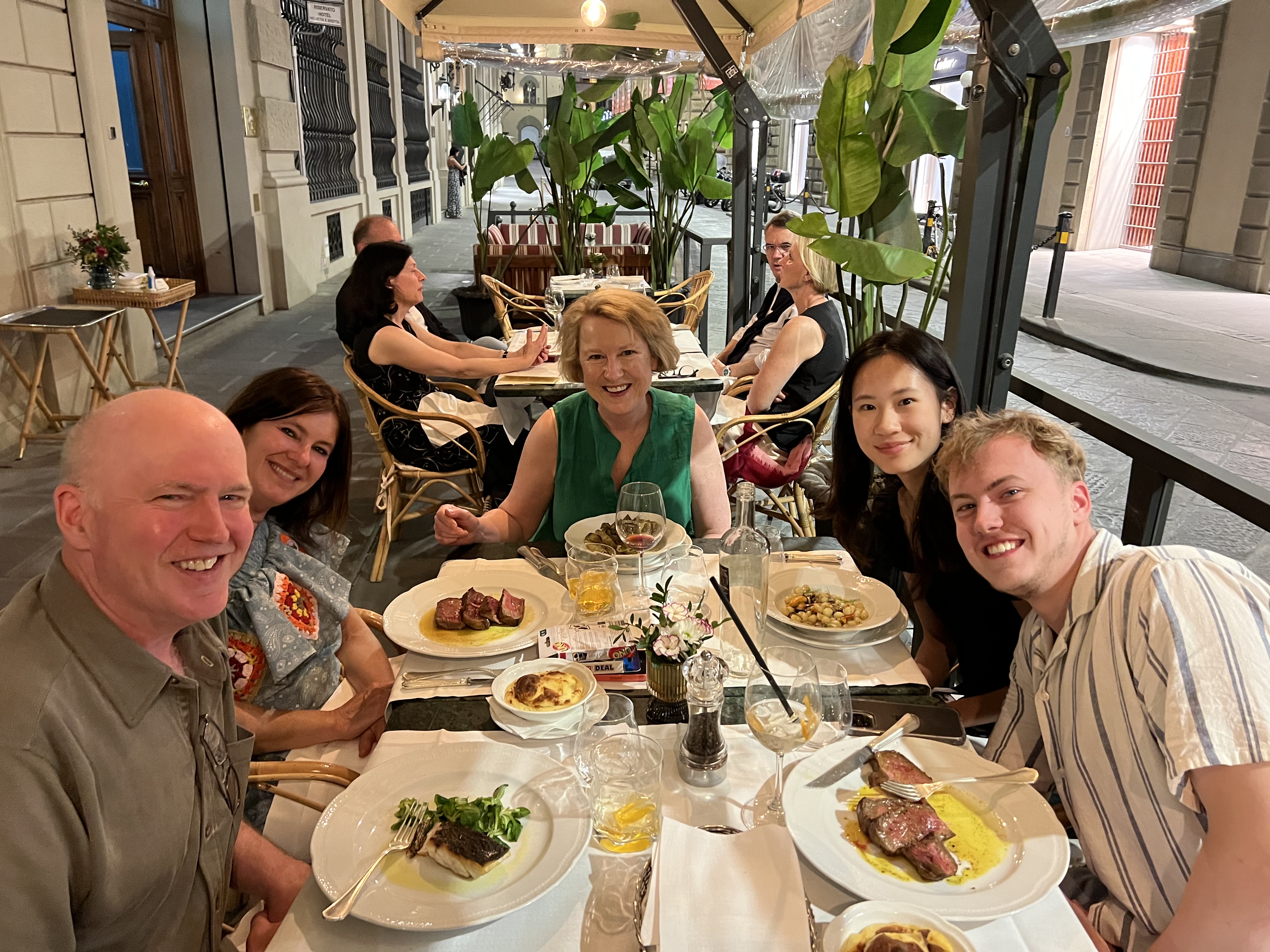 We had a wonderful, if very brief, stay in Florence, where we met up again with Grazia, who drove the 1 ½-hour drive to brave the heat and the crowds of a Florentine weekend with us. Florence is a small medieval city, with narrow, winding streets despite the best attempts of the ancient Romans to set it up as a traditional grid-patterned Roman military camp – the traces of which still remain in the main (wider) streets and the piazzas, one of which was the old Roman Forum. But I digress. The fact is that Florence is small, so when it is filled with masses of tourists – as it was this weekend – it feels extremely crowded. Regardless of what you may read in the news, European travel is full-on this summer. There were many Americans among the throngs, many of them young, but we also heard UK English, German, Russian, Chinese and Italian spoken among the tourists.