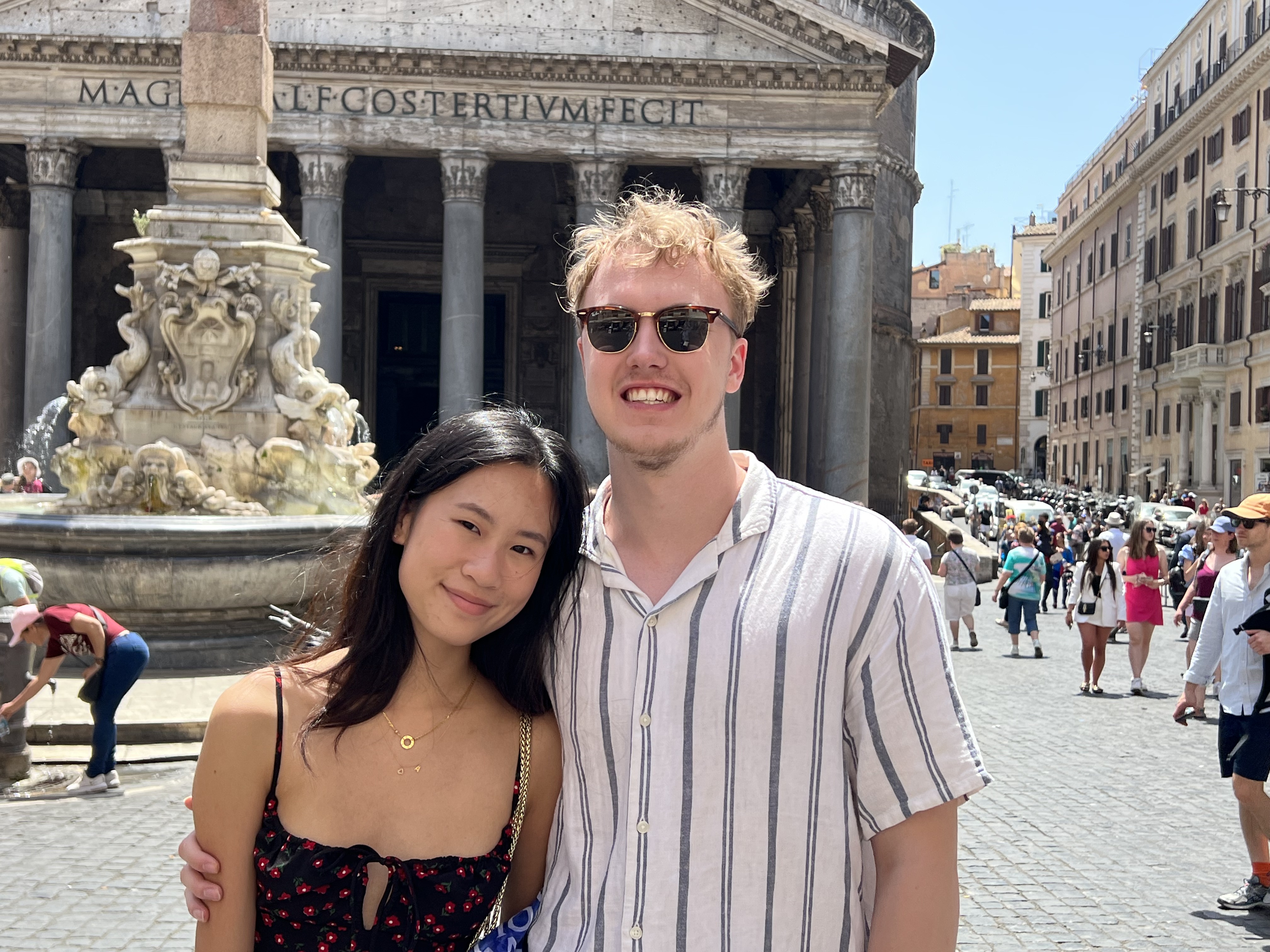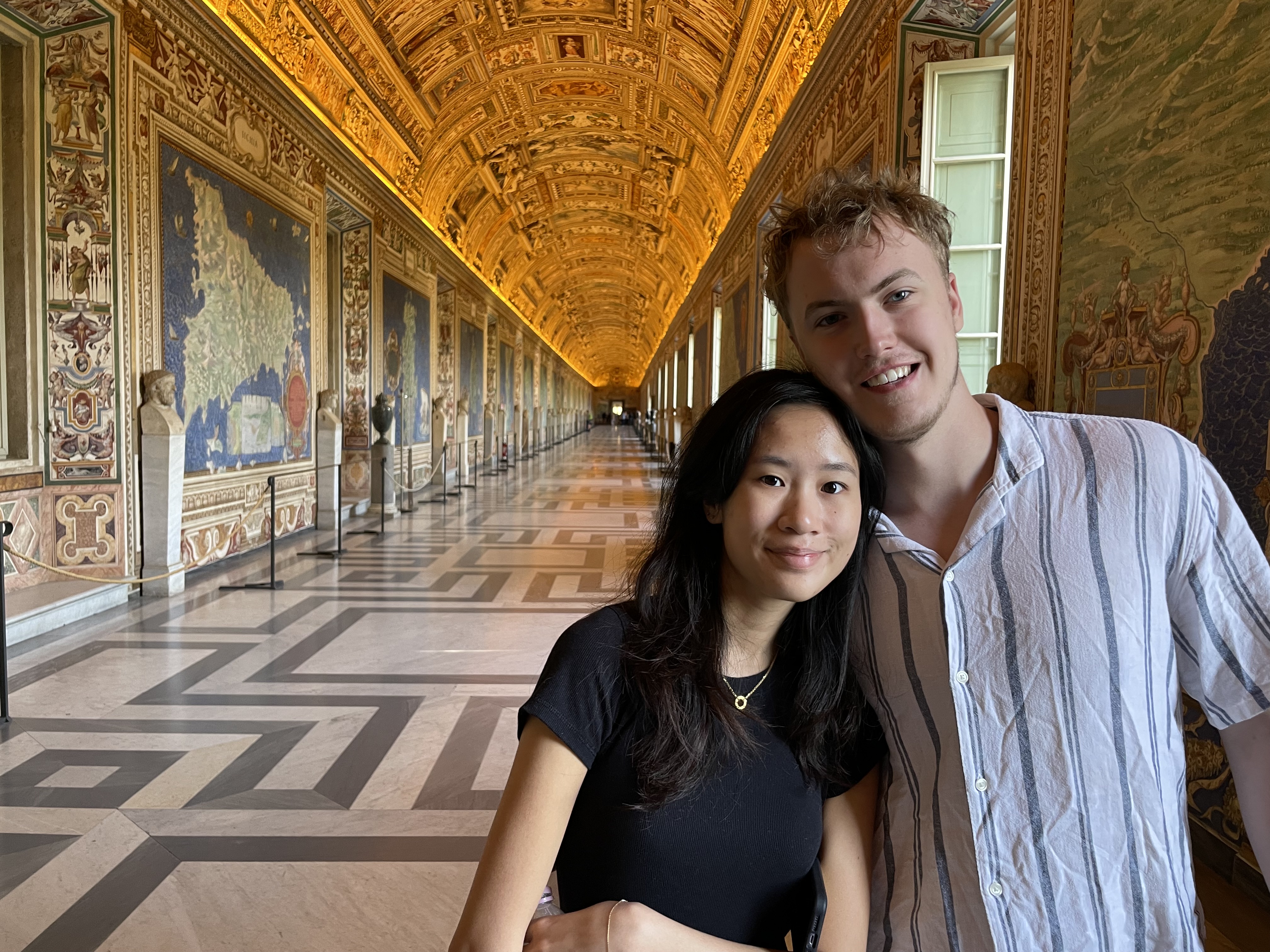 ROME – Tuesday, May 24, 2022 – I was dreading this day – in the best possible way – because I had bought a private tour for the Vatican that started at 7:15 a.m. and I had no idea what to expect, except that Will and Amy would likely be fairly grumpy to get up at 6 a.m. to see yet ANOTHER museum and church. It turned out to be absolutely wonderful – we had a guide for just the four of us, and she took us through parts of the vast collections of the Popes, seeing treasures from the ancient world – statues that changed the way we see – to the Renaissance and beyond. The ornate palaces of the popes, their self-aggrandizing art, their pillaging of ancient monuments, the famous Papal apartments of Pope Julius II with the amazing Raphael paintings, the Sistine Chapel! Rick was able to see his beloved School of Athens, which Will apparently was drawn to as well, with Aristotle holding his book the “Ethics,” a work Will has been wrestling with for the past year at Notre Dame. We also waited a half hour in the hot morning sun to see St. Peter’s Basilica, an awe-inspiring space the length of one and a half football fields and whose side arms are bigger than most churches. Rick commented that most of the churches we have seen on the trip would fit inside this one glorious space. Will perhaps gave it his highest compliment ever, saying it was like a movie.